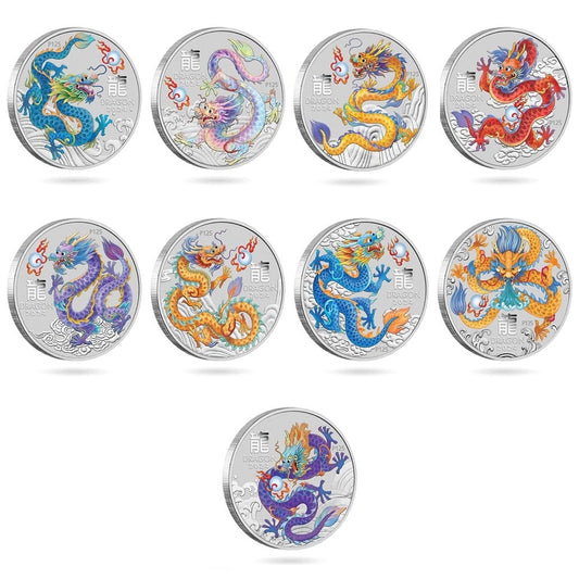 2024 PerthMint Australian Lunar Series III Year of the Dragon 1oz Silver 9 Coin CollectionRegular price $1,135.00 AUDRegular priceUnit price / per-
