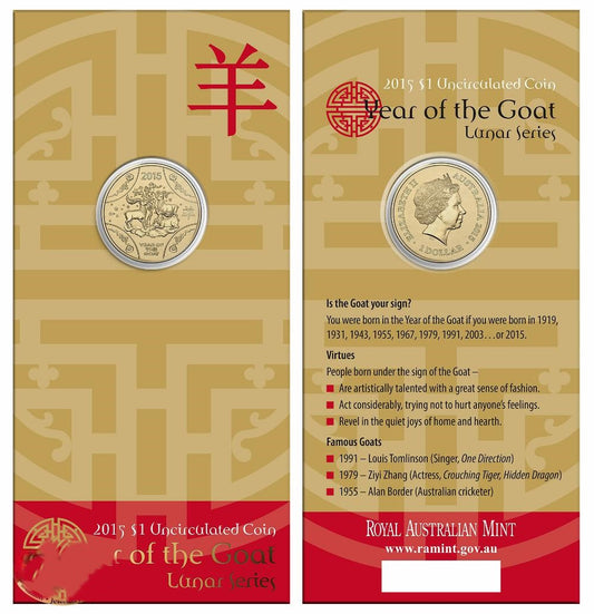 2015 Royal Australian Mint Lunar Year of the Goat $1 Unc CoinRegular price $35.00 AUDRegular priceUnit price / per-