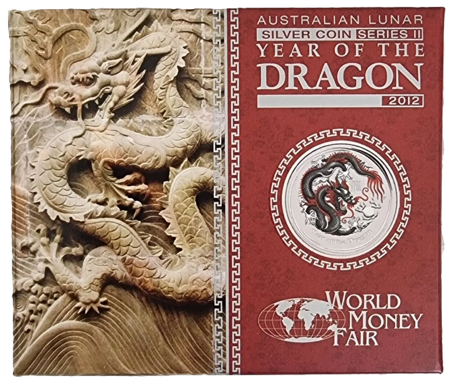 Struck from 1oz of pure silver, the Australian Lunar Series II - 2012 Year of the Dragon 1oz silver coloured coin was prepared to celebrate 2012 World money Fair event.