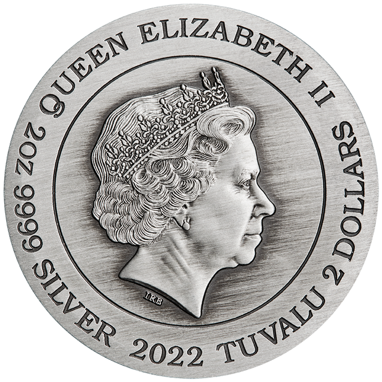 The obverse features the Ian Rank-Broadley effigy of Her Majesty Queen Elizabeth II, along with the coin’s weight, purity, monetary denomination, and 2022 year-date.