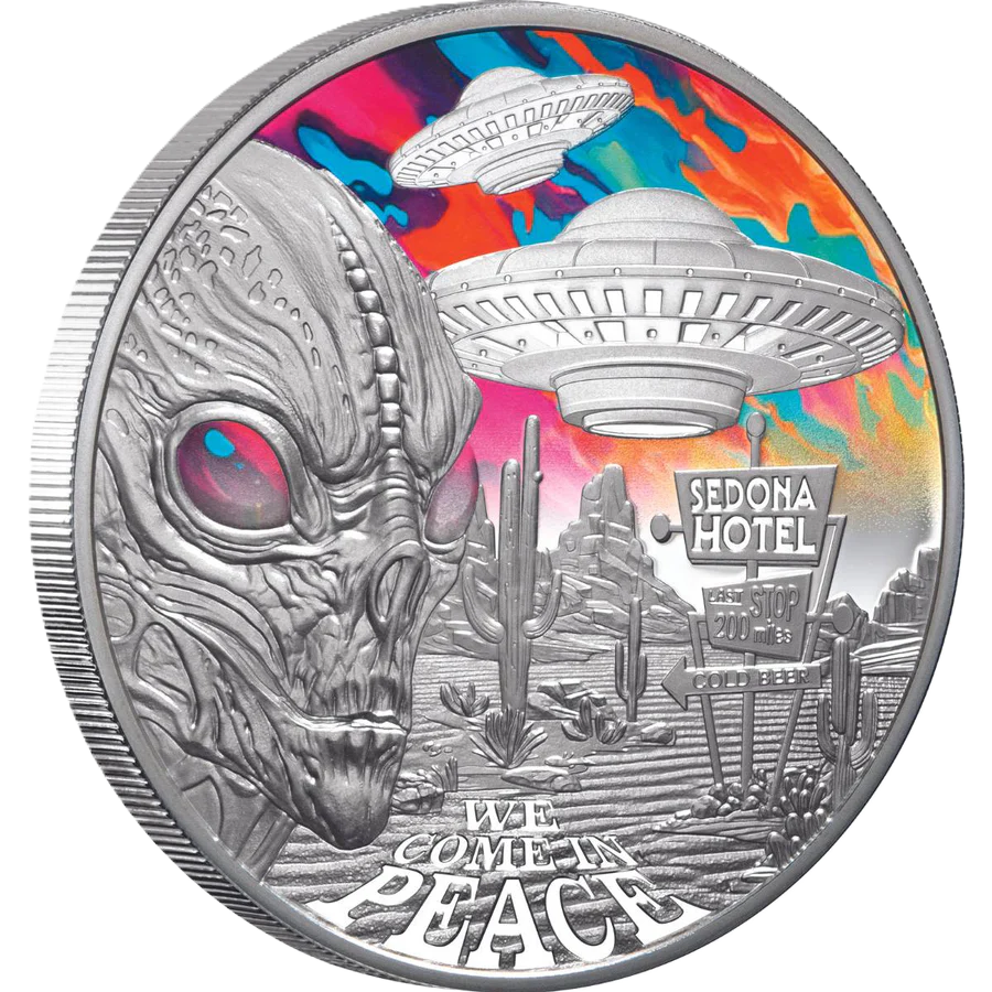 Sci-fi fans and coin collectors won’t have to travel all the way to Arizona to get their sighting, but with a mintage of only 999 planetwide, underpinned by a numbered Certificate of Authenticity, this exclusive legal tender specimen won’t remain a mystery long