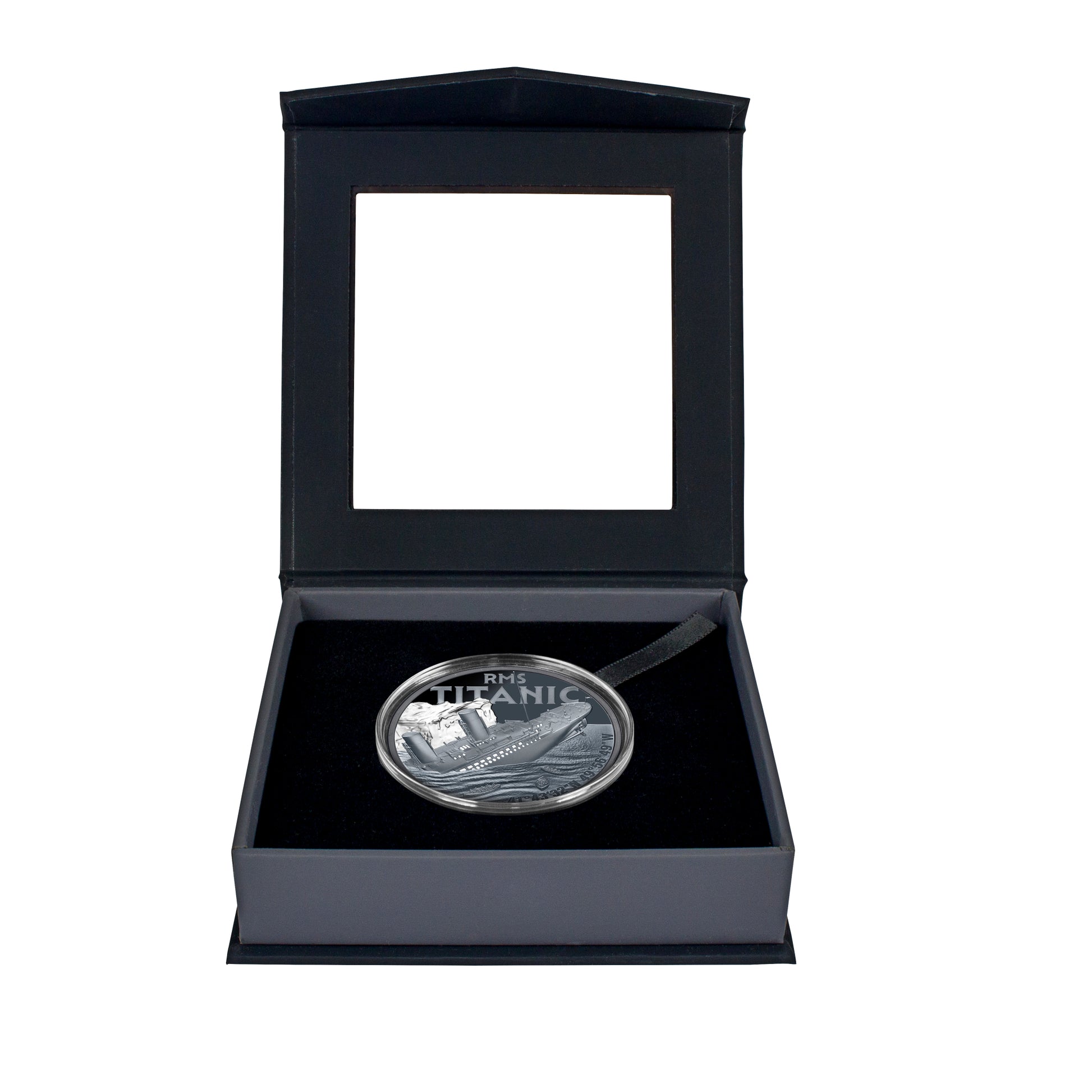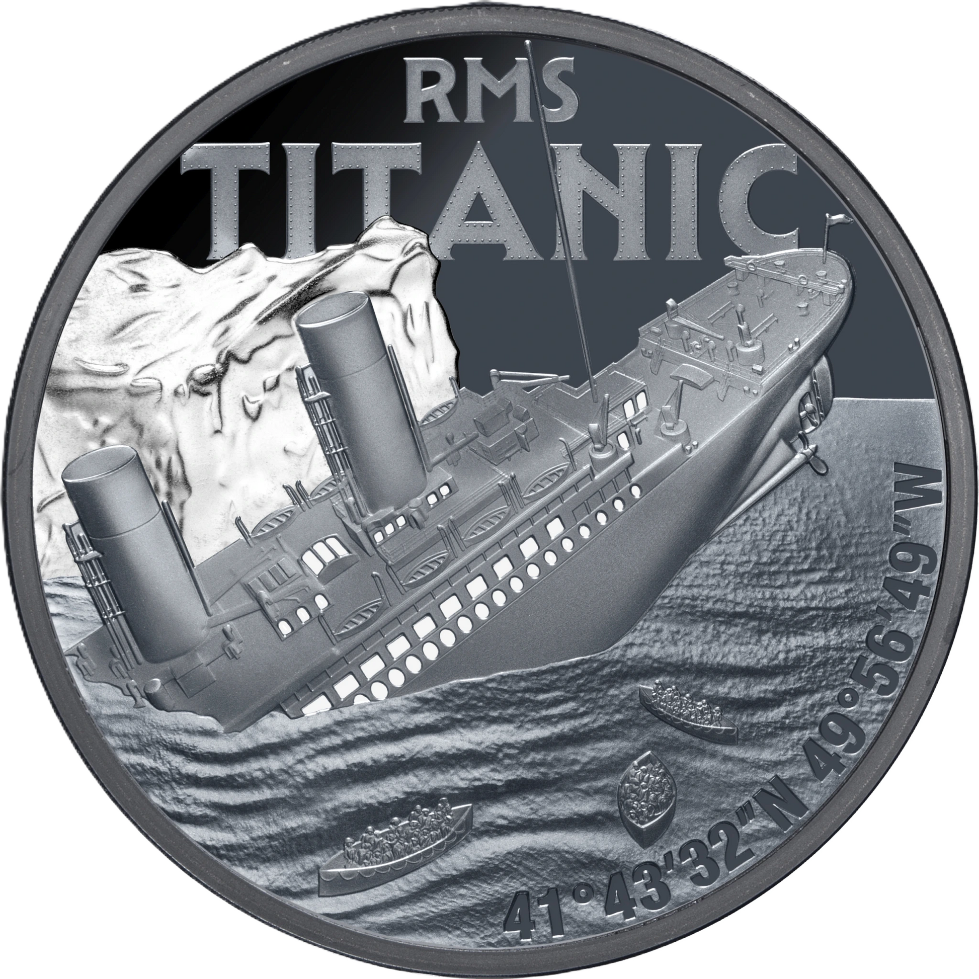 Using the power of modern minting to capture the essence of the disaster, which took place on a moonless night, just before midnight on the 14th of April, 1912, the coin is distinguished by a stunning Black Proof finish. The rich, dark hues form a stark contrast with the sparkling, polished silver of the ship’s windows, and with the iceberg that took her to the ocean floor. Issued to coincide with the 40th anniversary of the discovery of the shipwreck, the reverse also features the coordinates of the Titanic’s final resting place.