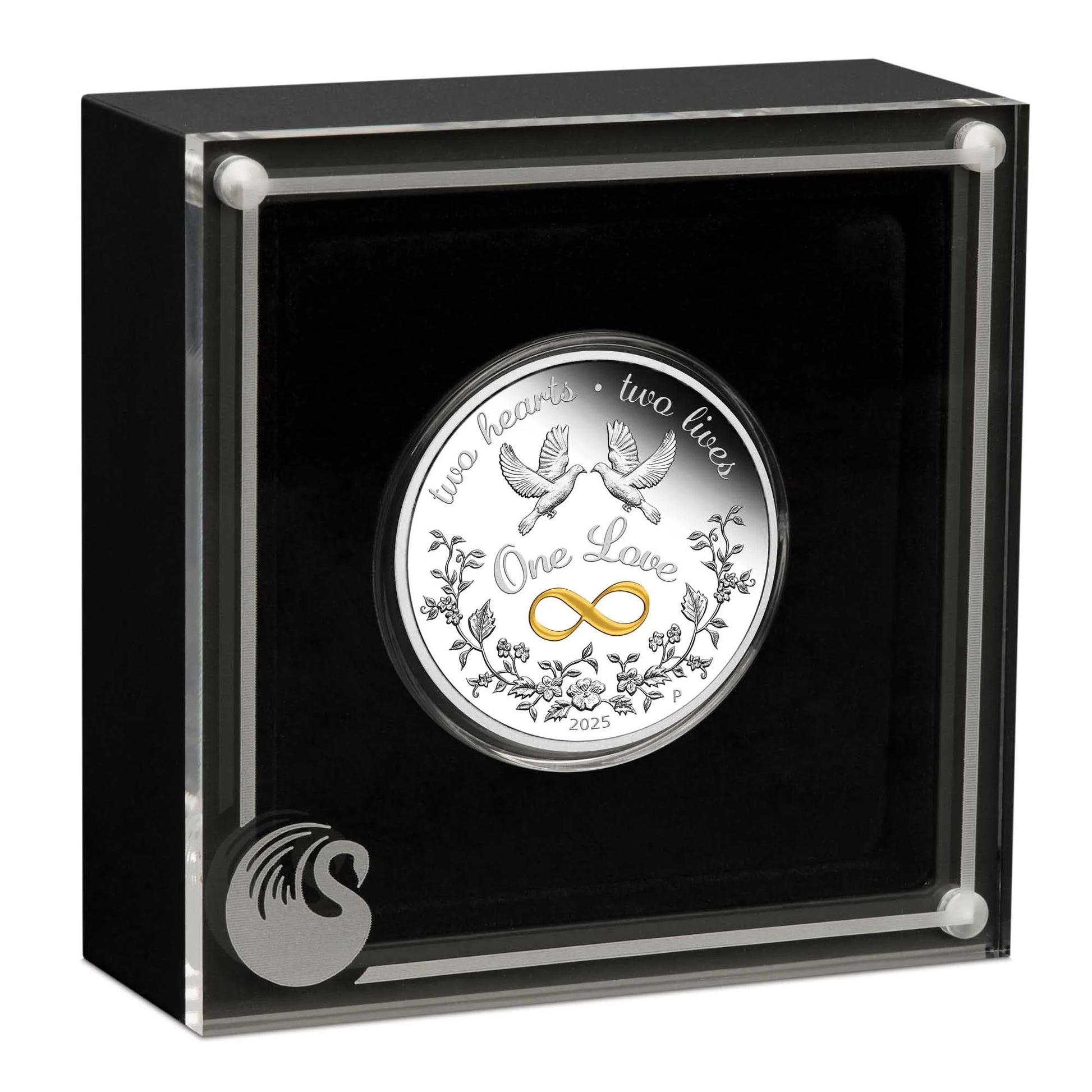 Exuding love, peace and harmony, the coin’s unique artistry includes two doves signifying unity, an infinity symbol in gold reflecting eternity of love, and an exquisite floral pattern. As well as The Perth Mint’s ‘P’ mintmark, the design also includes the romantic inscriptions ‘two hearts • two lives’ and ‘One Love’ and the 2025 year-date.