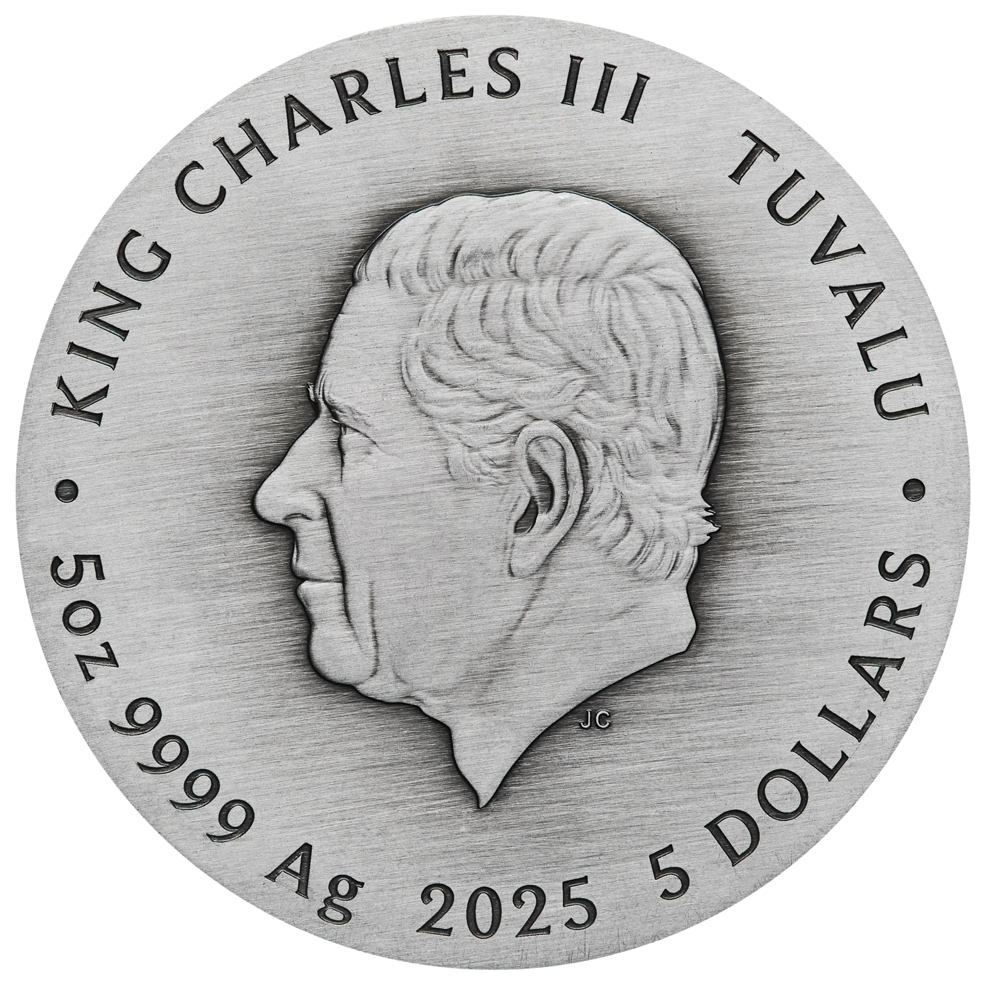 The obverse features the Jody Clark effigy of His Majesty King Charles III, together with the coin’s weight, purity, monetary denomination, and 2025 year-date.