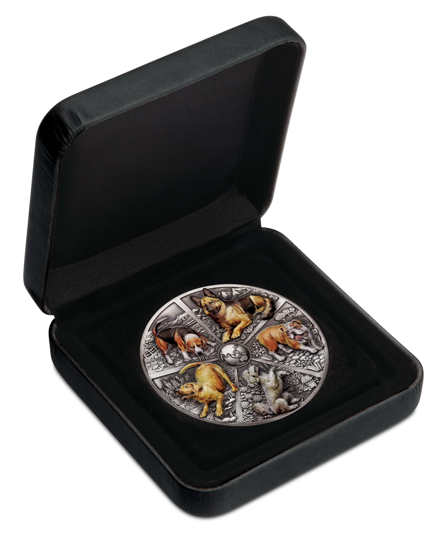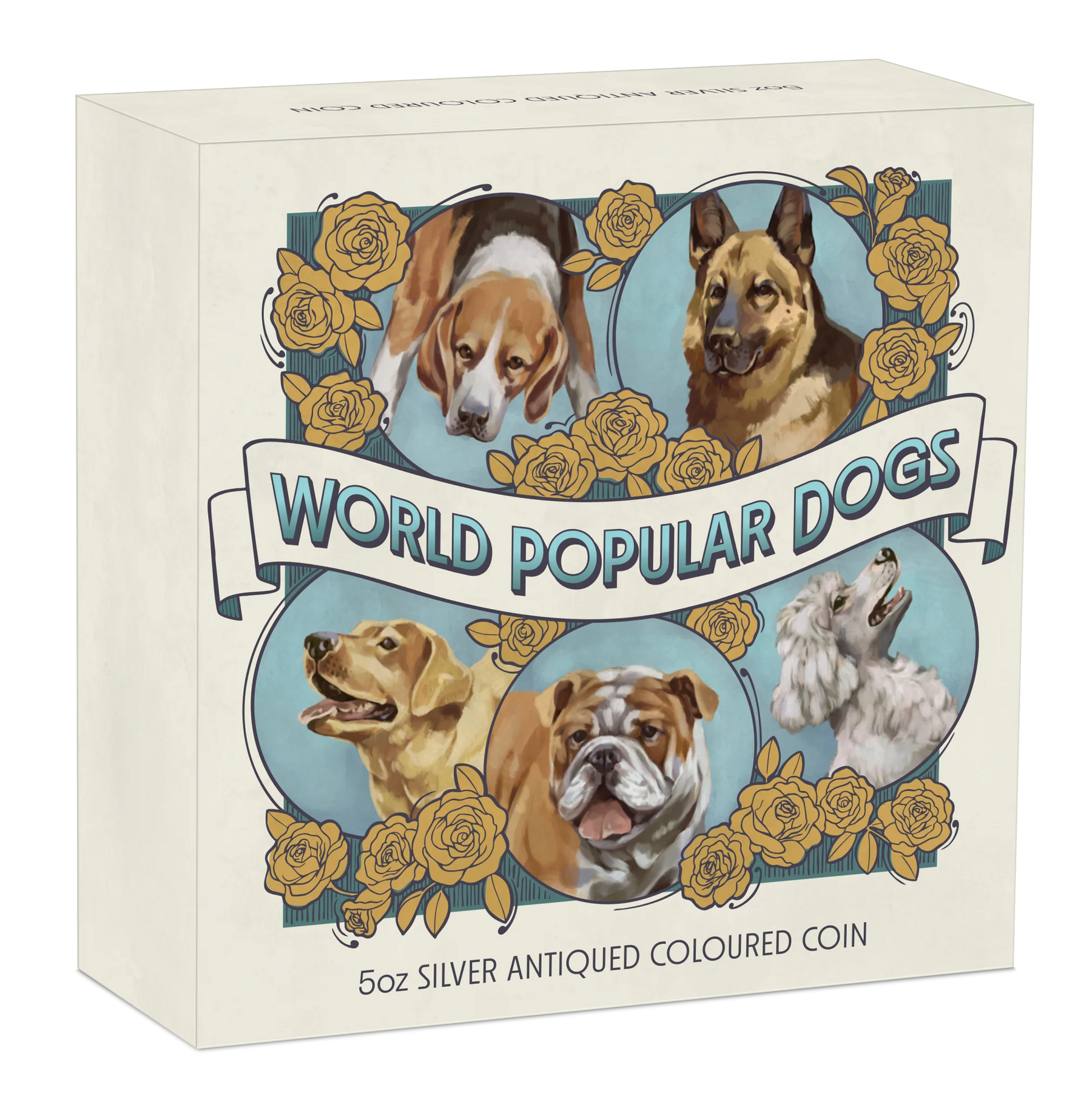 The Perth Mint honors these remarkable animals with the 2025 World Popular Dogs 5 oz Silver Antiqued High-Relief Colored Coin — a masterwork combining artistry, symbolism, and numismatic excellence.
