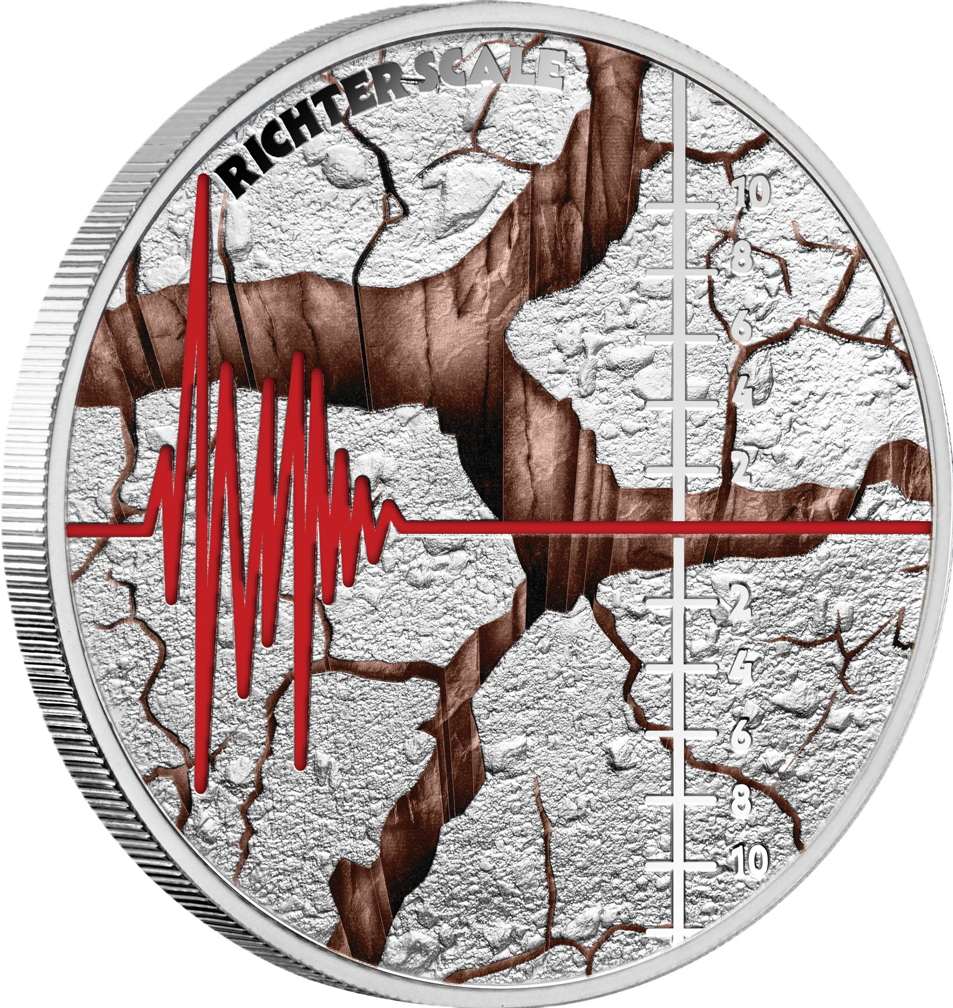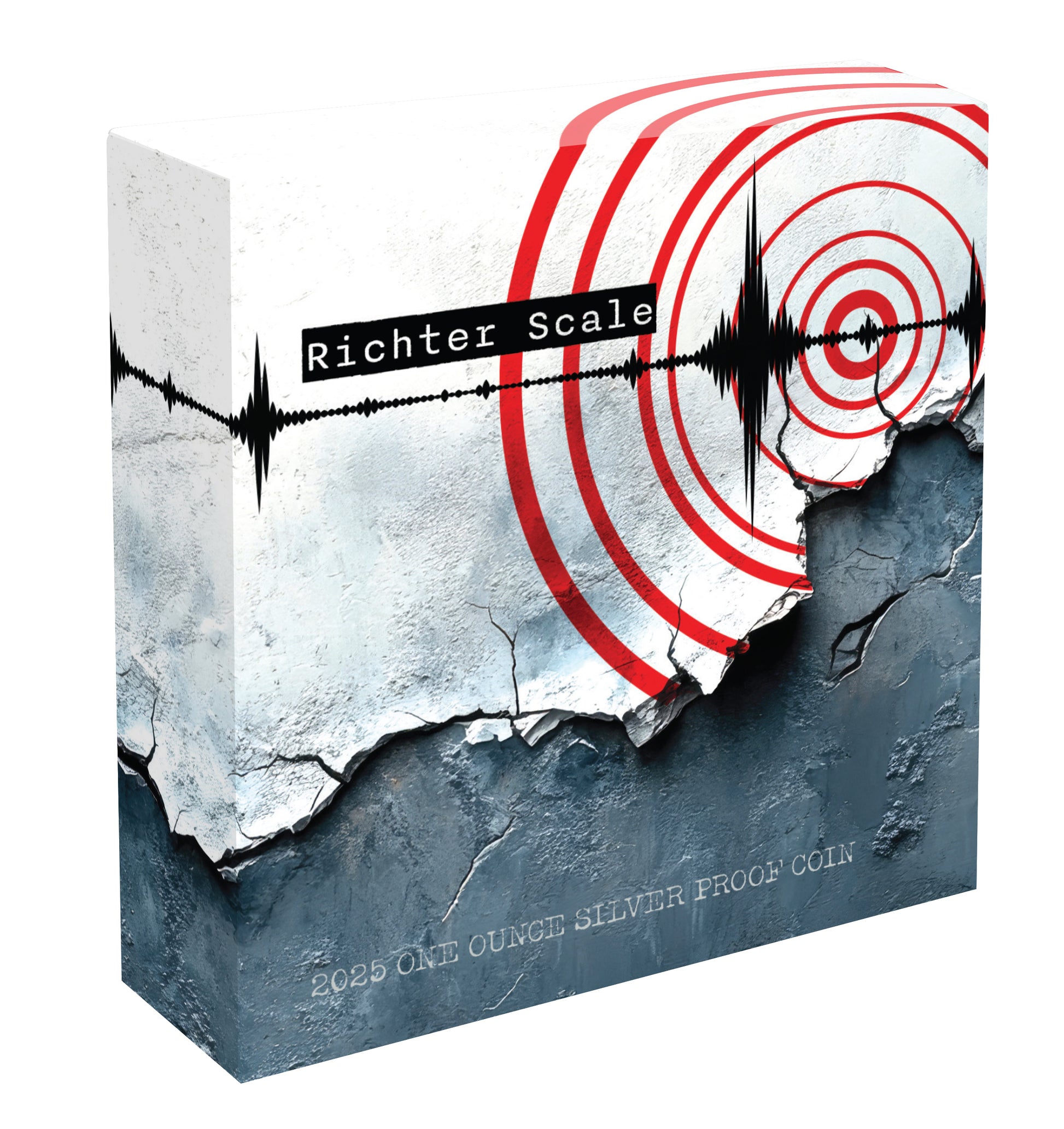 A dramatic example of the power of modern minting, the Richter Scale 2025 $1 1oz Silver Proof Coin captures the essence of an earthquake through the expert application of full-colour. United with a bright red portrayal of the Richter Scale in action, the use of full-colour creates the illusion of deep cracks in the coin, representing the deadly fissures created by earthquakes!
