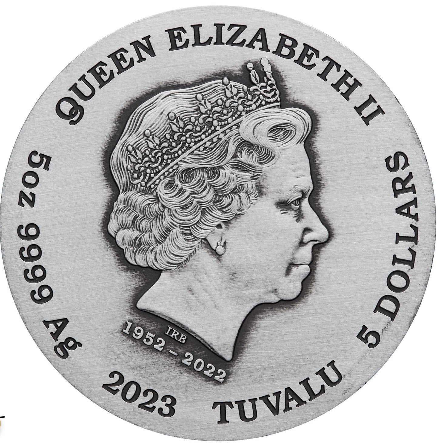The coin bears The Queen Elizabeth II Memorial Obverse, featuring the Ian Rank-Broadley effigy supplemented with the dates of her reign, as well as the weight, purity, monetary denomination and 2023 year-date.